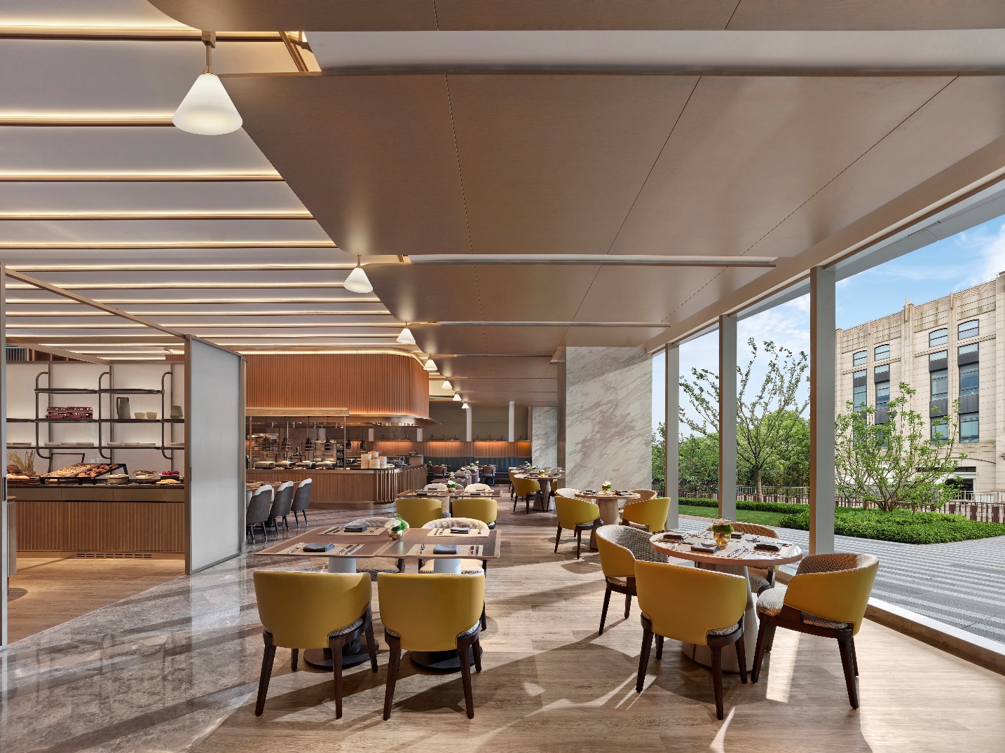 而作为此次风味叙事酒店的舞台,厨艺全日制餐厅 (Kitchen Craft) 以时空月台为设计灵感,采用开放式厨房布局,提供自助早餐及全日零点服务。餐厅空间通过几何立柱的巧妙设计,打造出风格多元的用餐环境。临河而设的户外用餐区,让宾客在品味美食的同时尽享自然景致。