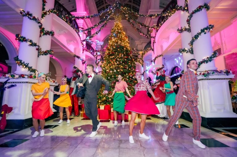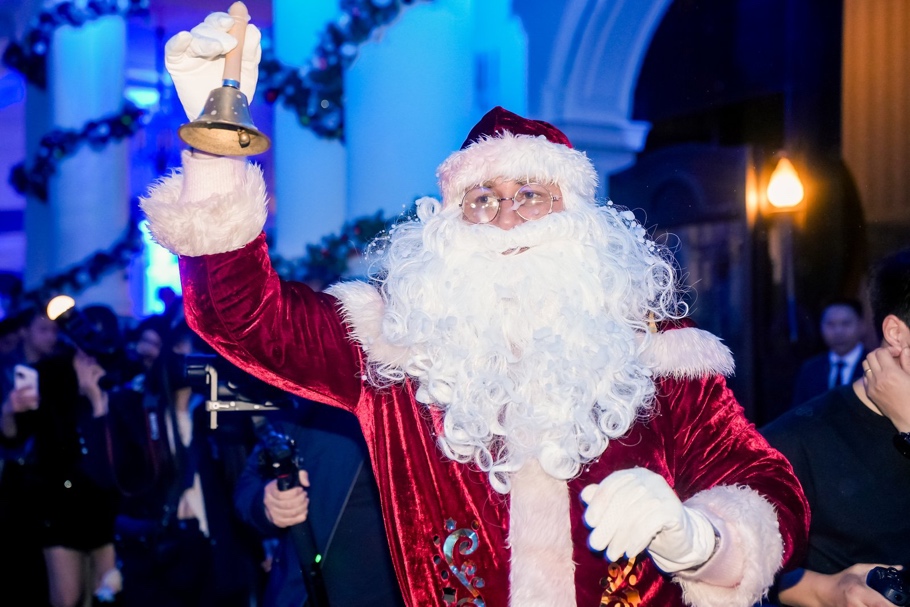 在宾客的共同见证下,高耸的圣诞树由外滩华尔道夫与Chopard香水联名点亮。瞬间,晶莹闪烁的彩饰与璀璨耀眼的灯光交织成一片温暖星海,将百年历史空间装点得宛如童话之境。伴随着欢快的节日旋律,憨态可掬的圣诞老人惊喜现身,与宾客亲切互动,传递浓浓祝福;身形修长的高跷步行者穿梭于人群之间,以优雅姿态派发节日惊喜;活力四射的摇摆舞表演者用轻盈的舞步旋起复古裙摆,将欢愉的氛围注入每一寸空气;而一旁的爵士演奏乐队则奏响慵懒迷人的乐章,让整个夜晚沉浸于丝绒般的音律之中。