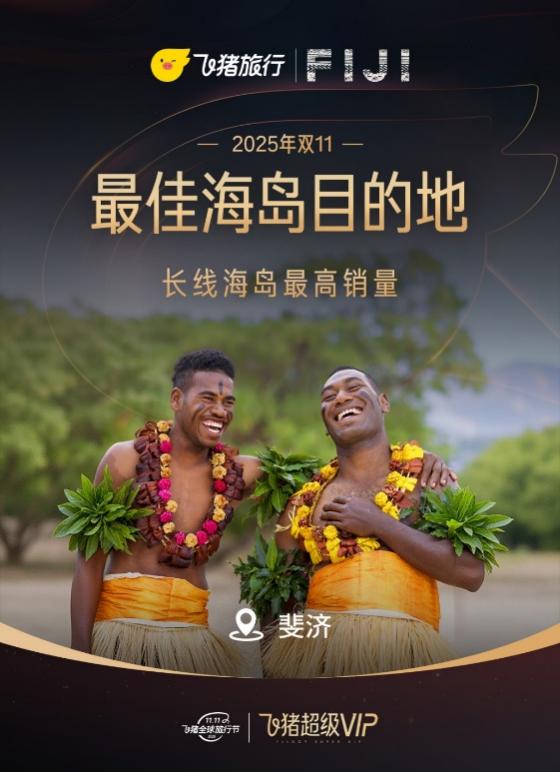 2025年12月11日,中国——在阿里巴巴集团旗下综合性旅游服务平台飞猪发布的2025双十一旅行榜单中,斐济凭借出色的市场表现,荣获“最佳海岛目的地”称号,并位列全球长线海岛销量榜首位。这一成绩不仅反映了中国游客对斐济的高度青睐,也印证了斐济旅游局中国市场团队、斐济航空与飞猪平台在本地化精准营销方面的卓有成效的合作。双十一期间,斐济相关度假产品预订量同比提升22%,活动参与商品数增长43%,展现出中国游客对斐济旅游的持续热情与强劲需求。