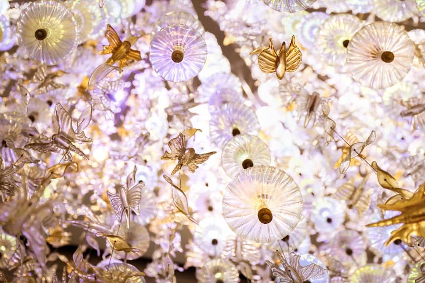 宾客步入一楼大堂,抬头即见大型水晶装置如星河凝固,又似蝶翼轻悬。光线穿梭棱面,折射时间轨迹,与展置于公共区域的作品形成视觉呼应,开启一场光与艺术的对话。